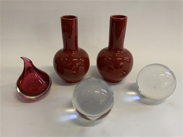 Lotto composto da una coppia di vasi in ceramica smaltata in rosso sotto vetrina in recanti etichetta adesiva sotto la base, un vasetto soliflore in vetro sommerso incolore ametista chiaro unito a due sfere in vetro massello trasparente incolore di epoche e manifatture differenti. Secolo XX. (Coppia di vasi cm h 21; vasetto cm 14; sfere cm h 10) (lievi difetti)