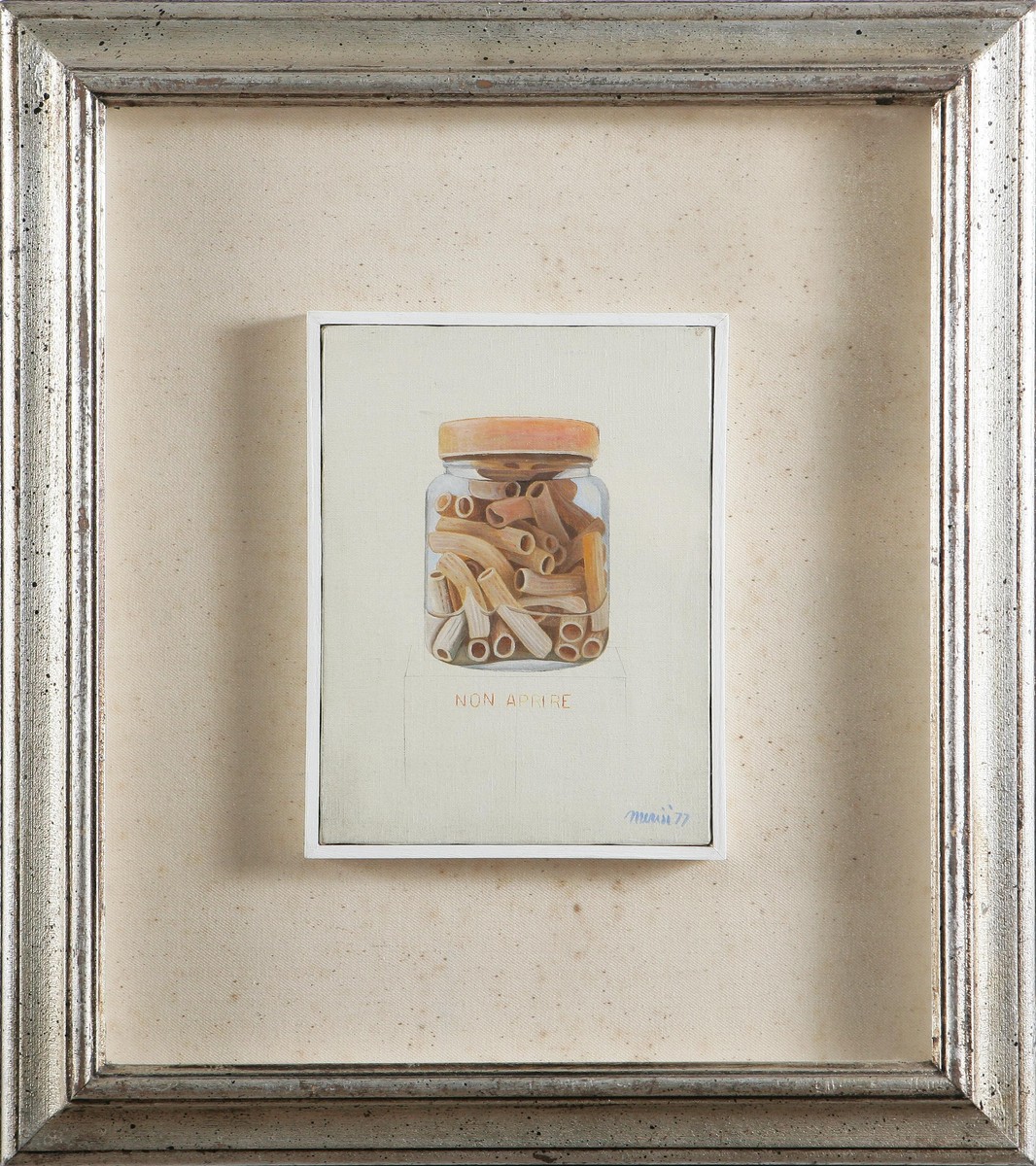 FABRIZIO MERISI (n.1937) Non aprire, 1977. Olio su tela. Cm 24x18. Firma e data in basso a destra, titolo al centro.