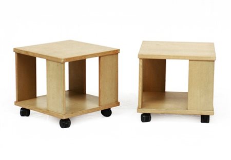 Coppia di comodini su rotelle in legno di betulla bordato e impiallacciato. Ita