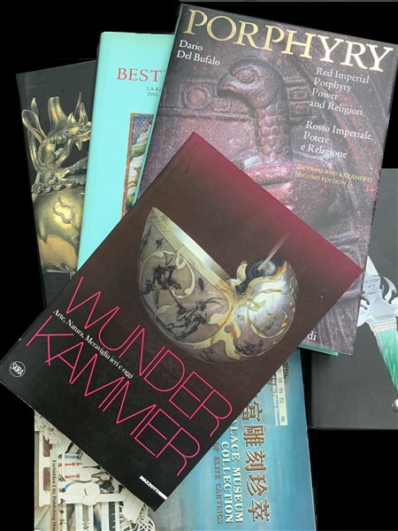[ARTE] lotto di otto volumi : Art and Design in Modern Custom Folding Knives di David Darom. Londra: White Star, 2006 - Wunderkammer: Arte, Natura, Meraviglia ieri e oggi a cura di Lavinia Galli Michero e Martina Mazzotta. Milano: Skira, 2013 - Old Javanese Gold di Miksic John. New Haven: Yale University Art Gallery, 2011 - New Guinea Highlands: Art from the Jolika Collection. London: Prestel, 2017 - The Palace Museum Collection of Elite Carvings. China: Forbidden City Publishing House, 2002 - Estremo Oriente Animali e creature fantastiche di Ugo Donati. Touring club italiano, 2006 - Bestie e bestiari: la rappresentazione degli animali dalla preistoria al Rinascimento di Francesco Mezzalira. Torino: Allemandi, 2002 - Porphyry. Red Imperial Porphyry. Power and Religion, 2nd Edition, di Dario Del Bufalo. Londra: Allemandi, 2012