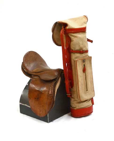 Lotto composto da una sacca da golf e una sella da cavallo in cuoio con basi in