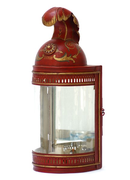 Portacandela in lamiera laccata a fondo rosso con parte superiore "ad elmo di d