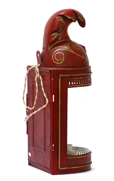 Portacandela in lamiera laccata a fondo rosso con parte superiore "ad elmo di dragone" decorato in policromia e dorature a fregi dorati. Inizio secolo XX (h. cm 50)