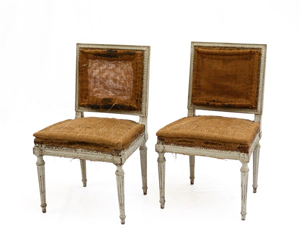Coppia di sedie in legno intagliato e laccato in stile Luigi XVI (difetti)
