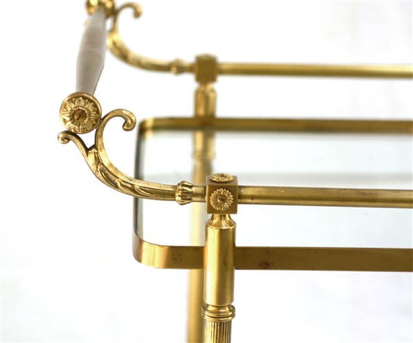 Carrello in ottone e vetro a due ripiani con vani portabottiglie (difetti)