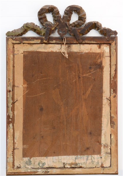 Specchio in legno intagliato e dorato con cimasa a fiocco, secolo XIX (cm 73x48) (difetti)