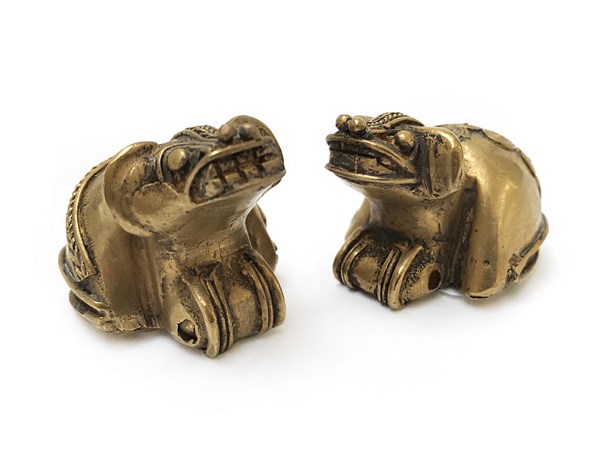 Due campanelli in ottone a guisa di cagnolini. India o Tibet, inizio secolo XX