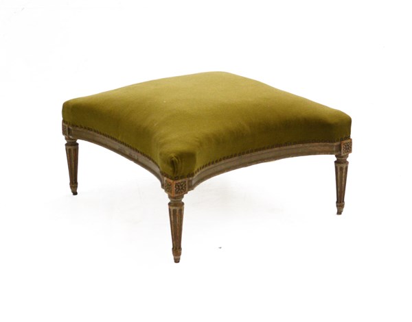 Pouff di forma sagomata in legno intagliato e laccato a fondo verde, piedi scanalati. Rivestito in velluto verde (cm 70,5x67x35) (difetti)