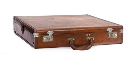 Valigia porta abiti in cuoio contenente diverse grucce, iniziali impresse "MCA" (difetti)