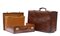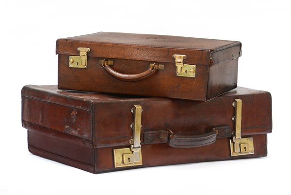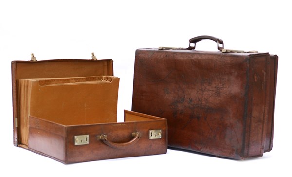 Lotto composto da una valigia portadocumenti in cinghiale iniziali impresse "JAAH", Inghilterra inizi sec. XX unita ad una valigia in cuoio con applicazioni in metallo color ottone, Inghilterra inizi sec. XX (difetti e gravi segni d'uso)
