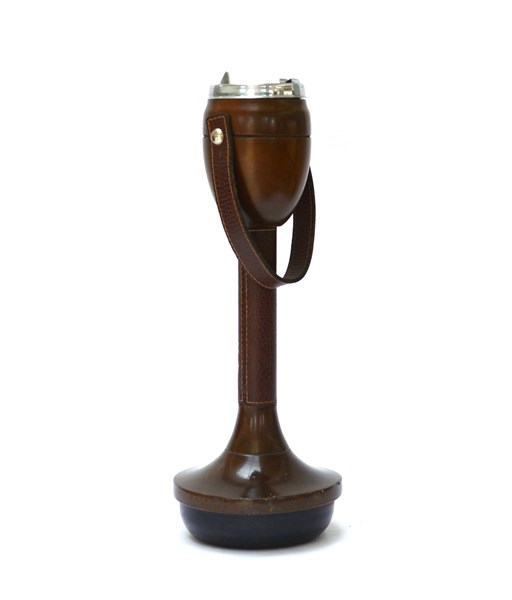 Posacenere da terra con struttura in legno massello e rivestimento in pelle. It