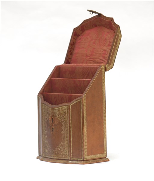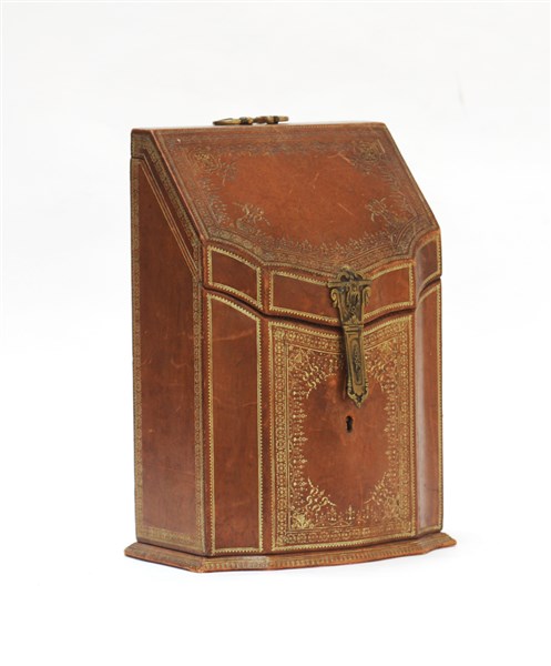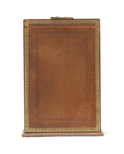 Cofanetto porta documenti in pelle impressa in oro. Marcata alla base A la marquise de Sévigné. Francia secolo XX (h. cm 31)