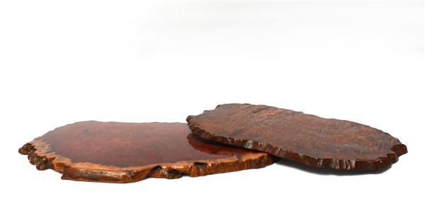 Due vassoi sagomati in legno e radica (cm max 66x39 ca.)