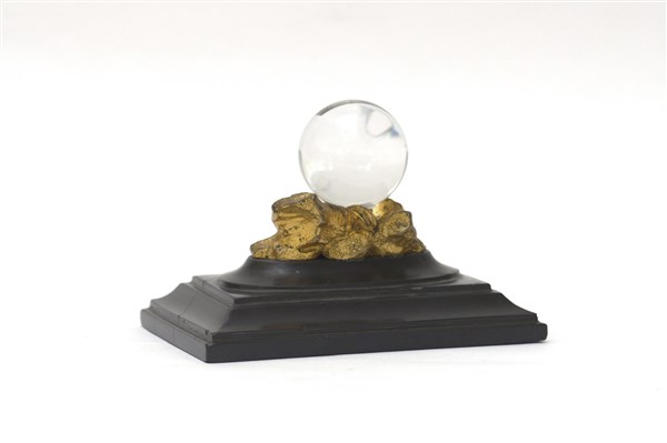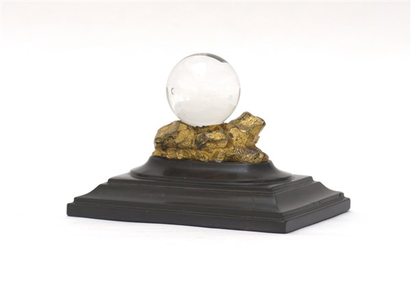 Palla in cristallo su base in bronzo dorato e marmo nero (lungh. cm 16) (restau
