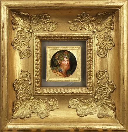 Scuola del secolo XIX "Bacco" miniatura tonda in avorio montata in teca (d. cm 6)