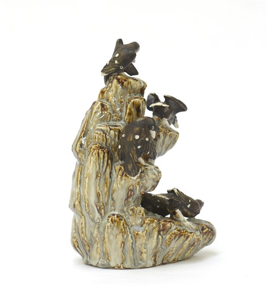 Manifattura del secolo XX, scultura in porcellana policroma invetriata raffigurante rapaci su roccia (h. cm 21) (restauri)