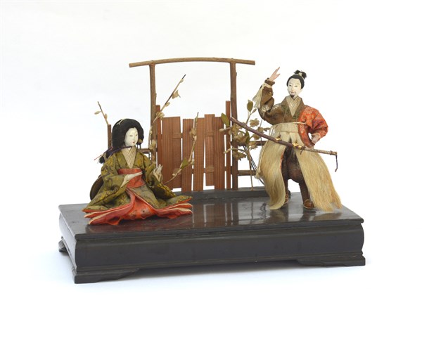 Modellino teatrale composto da due figure in legno laccato vestite con abiti in seta ricamata in paesaggio con arbusti, base in legno