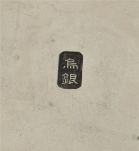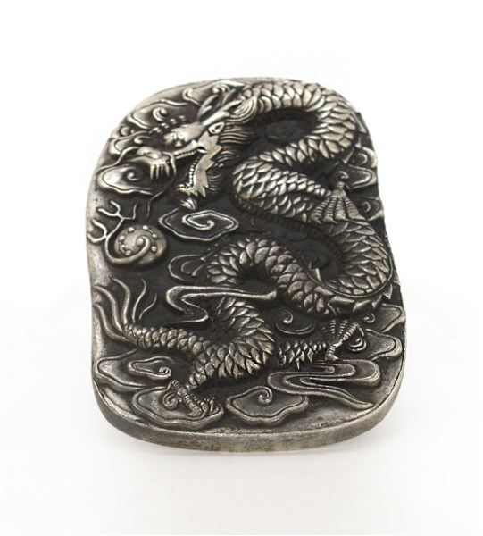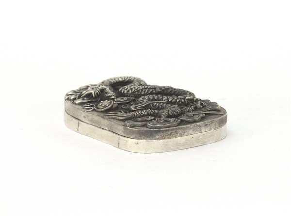 Scatola porta inchiostro in metallo argentato, coperchio con drago tra nuvole in rilievo, marcato alla base Wu-Yinh