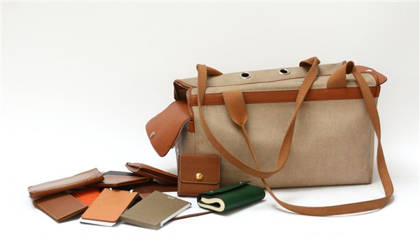 Lotto composto da un trasportino per cane/gatto di piccola taglia in canvas e cuoio color cognac e numerosi taccuini, portadocumenti, portafoglio e pila da borsetta (tg. varie) (difetti e mancanze)