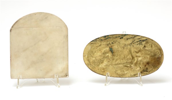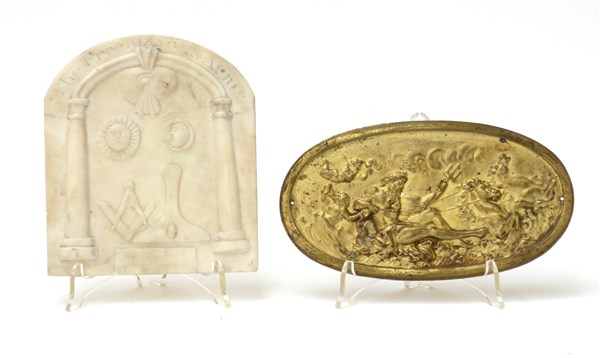 Lotto composto da un altorilievo in marmo con simboli massonici e una placca in bronzo dorato raffigurante Nettuno (difetti)