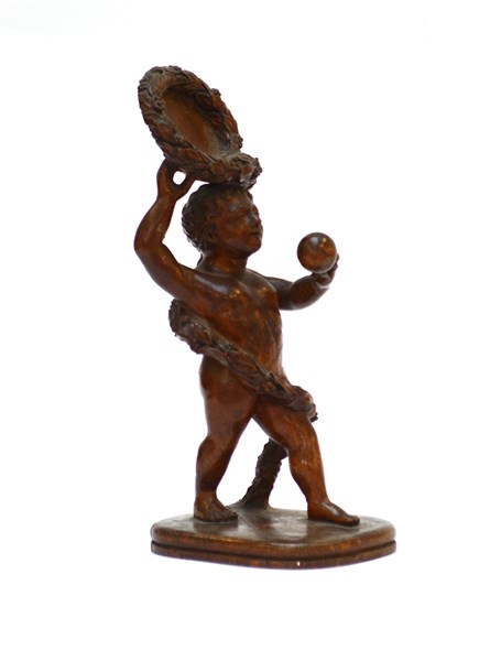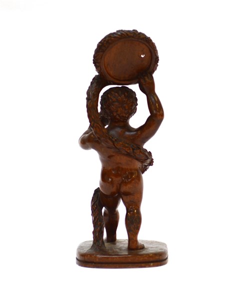Porta orologio da tasca in legno scolpito a tutto tondo a figura di putto. Secolo XIX (h. cm 26) (difetti)