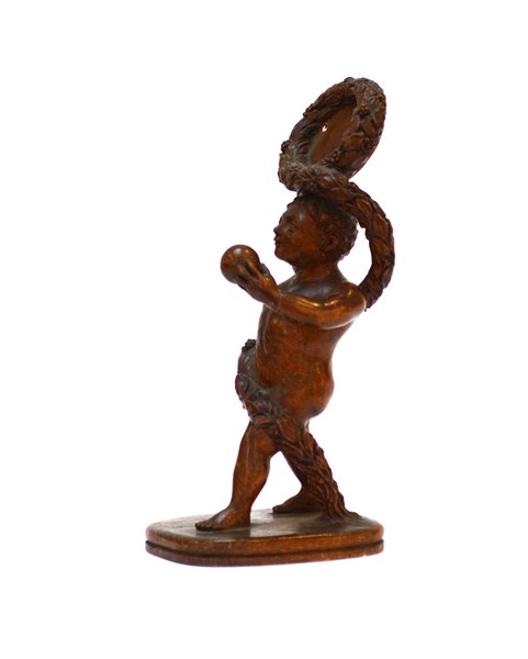 Porta orologio da tasca in legno scolpito a tutto tondo a figura di putto. Seco