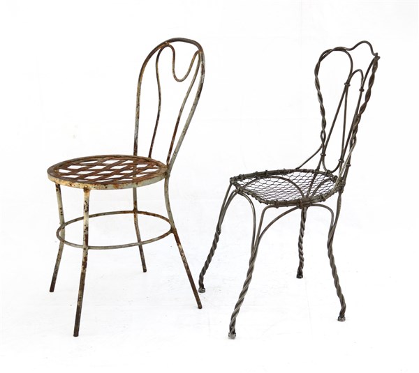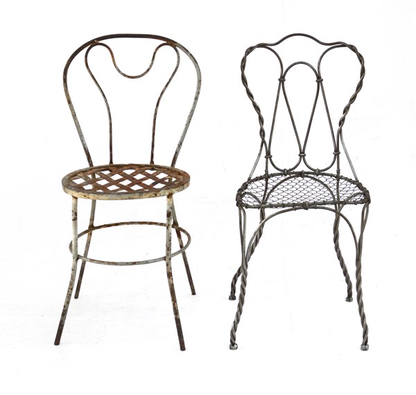 Lotto composto da due sedie in ferro battuto, schienali e sedute traforate (difetti)