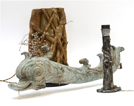 Lotto composto da una lampada in metallo argentato raffigurante un tronco, una in juta e legno ed un fregio scolpito a delfino (difetti)