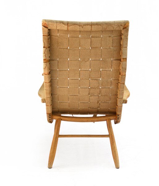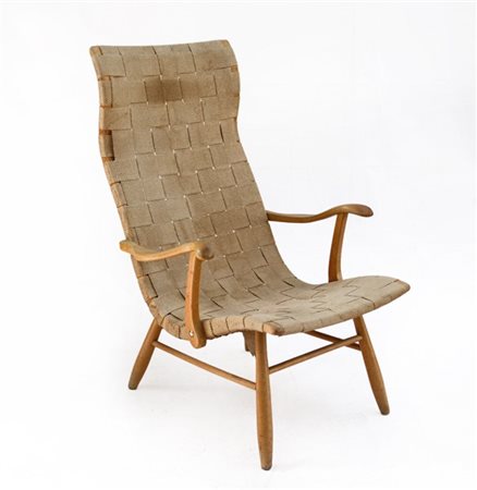Poltrona con struttura in faggio, seduta in corda intrecciata. Finlandia, anni '50. (cm 63x100x76) (difetti)