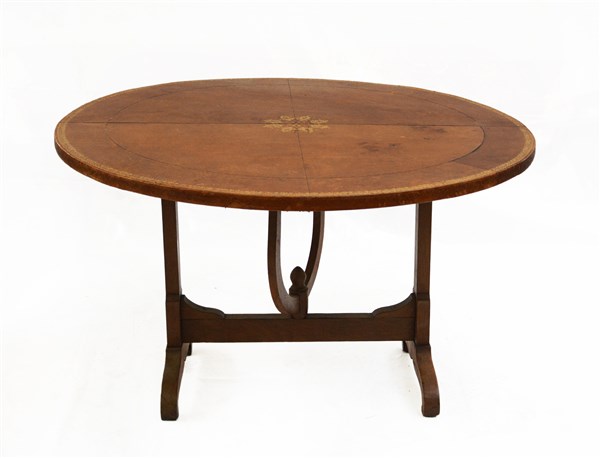 Tavolo a vela con piano di forma circolare rivestito in pelle impressa in oro, gambe mosse (d. cm 111) (difetti)