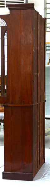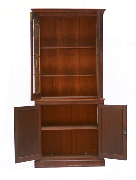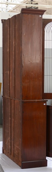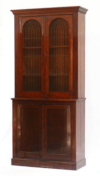 Mobile a due corpi in mogano, parte superiore a due ante a giorno e due ante pannellate nella parte inferiore, secolo XIX (h . cm 225,5x107x42) (difetti)