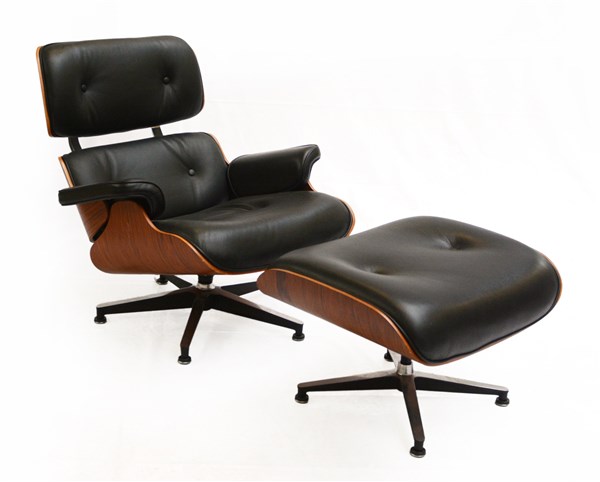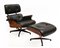 Poltrona con poggiapiedi ispirata al modello 670-671 di Charles Eames.Italia, Produzione recente. Guscio in compensato curvo placcato in palissandro indiano, cuscini rivestiti in pelle, basi in fusione di alluminio. Recante etichetta adesiva "Handmade in Italy" (poltrona: cm 81,5x78x90; poggiapiedi: cm 63x43,5x53) (lievi difetti)