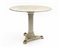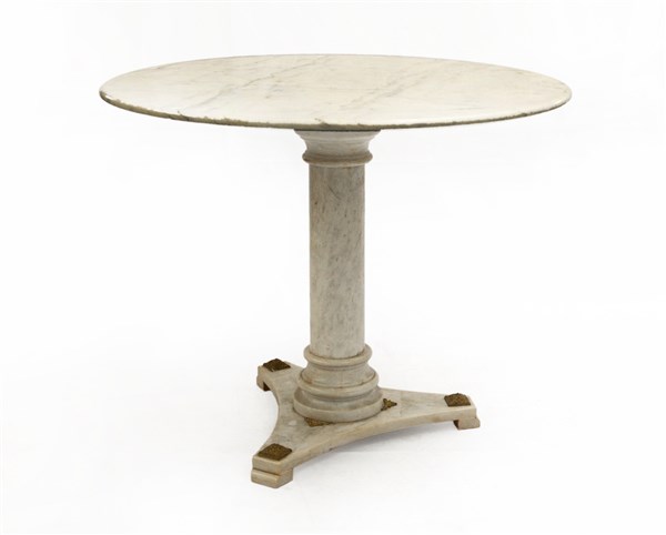 Tavolo con piano circolare in marmo bianco decorato con applicazioni in metallo dorato, fusto a colonna poggiante su base sagomata (d. cm 110xh. cm 89)