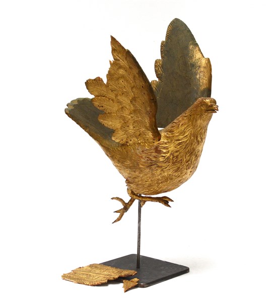 Scultore del secolo XIX volatile in legno intagliato e dorato a tutto tondo (h cm 41 ca.) Su base in ferro (difetti e rotture)