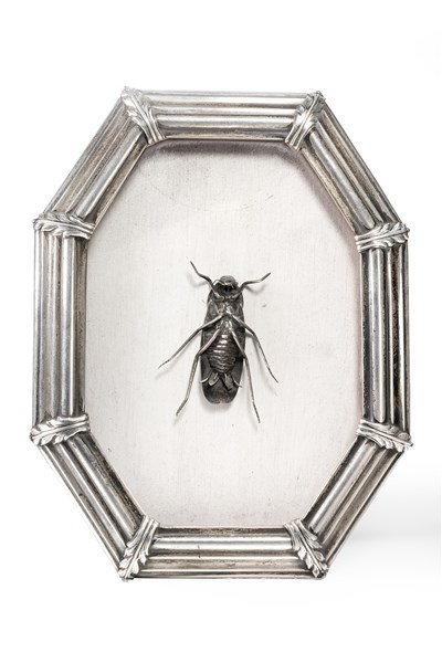 Bacheca con cornice ottagonale in argento e contenente uno scarafaggio in metallo argentato (h. cm 18,4)
