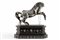 Cavallo rampante in argento finemente sbalzato e cesellato con testa amovibile, poggiante su base in legno ebanizzato decorata con applicazioni in argento a teste leonine e rosoni. Punzoni non decifrati, secolo XIX (h. tot cm 22,4)
