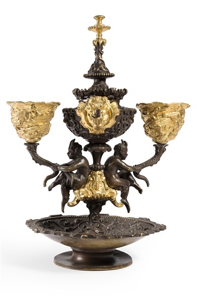 Lampada ad olio in bronzo brunito e cesellato a motivi fogliacei, porta stoppini, vasche e fregio in bronzo dorato. Secolo XIX (h. cm 30) (difetti)