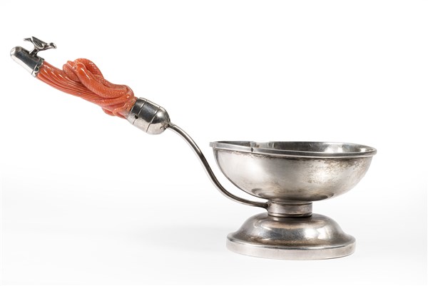 Lotto 2492 | Bugia in argento con presa decorata in corallo scolpito a serpente avviluppato