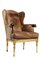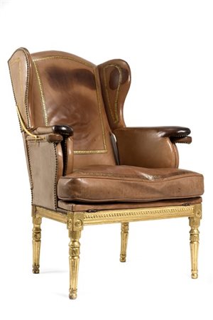 Poltrona chaise longue in pelle impressa in oro con schienale reclinabile e seduta ribaltabile, piedi in legno scanalato e dorato (difetti)