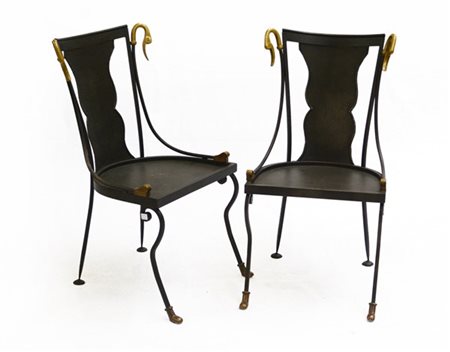 Coppia di sedie con struttura in ferro brunito e ottone nello stile di Maison Jansen, piedini anteriori ferini e finali a testa di cigno. (cm 43x80x45) (lievi difetti)