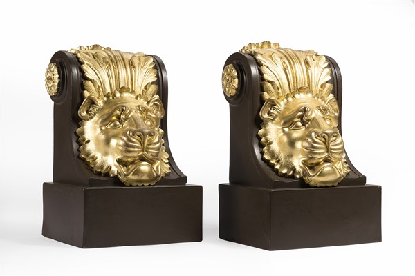 Coppia di fregi ricavati da alari in bronzo brunito con rosoni e teste leonine dorate. Secolo XIX (h. cm 24)