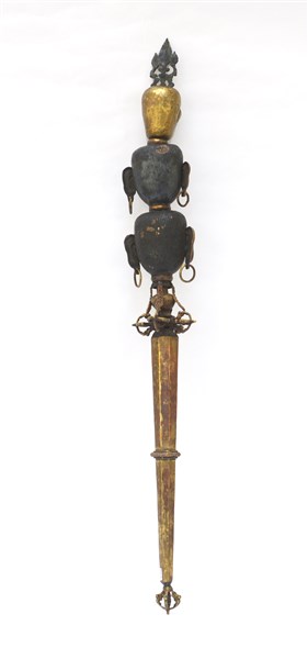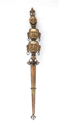Scettro rituale tibetano in rame dorato e parzialmente dipinto, sec. XIX (h. cm 79,2) (difetti)