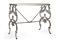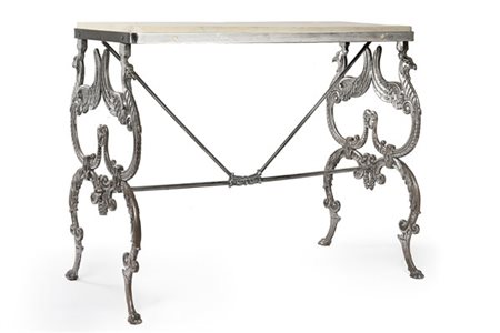 Tavolino in ferro, supporti con piedi ferini e teste d'aquila alate, piano rive