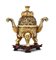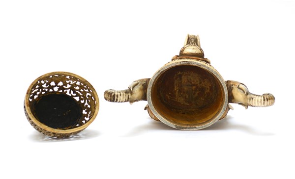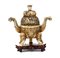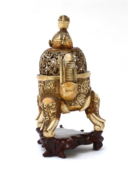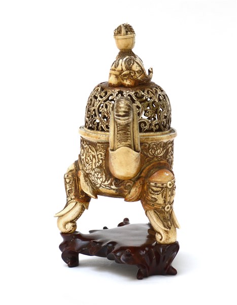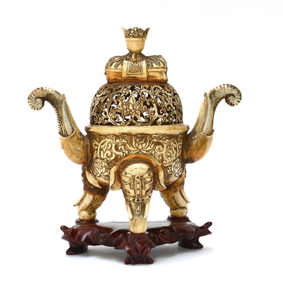 Incensiere tripode in avorio finemente intagliato a motivi floreali, piedi e anse a teste di elefante, base in legno