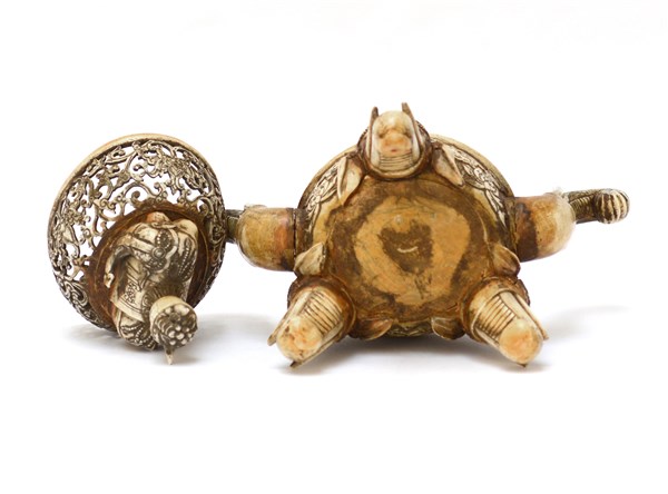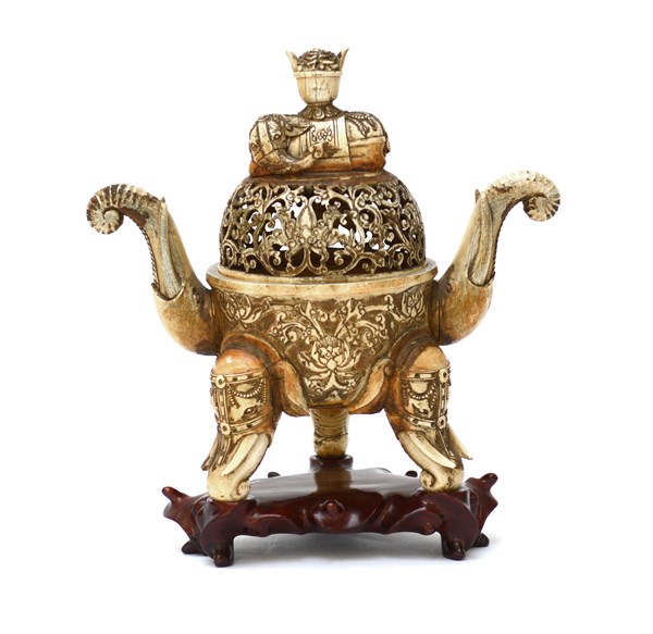 Incensiere tripode in avorio finemente intagliato a motivi floreali, piedi e an