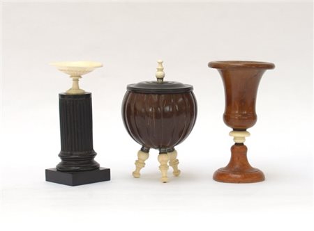 Lotto composto da una colonnina sormontata da un vaso in avorio, Francia secolo XIX con etichetta alla base, un vaso tornito ed una noce con ghiere e piedi in avorio argentato del secolo XIX
