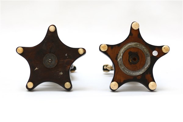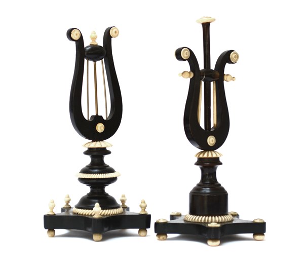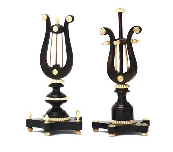 Arte del secolo XIX coppia di elementi decorativi a forma di lire in legno ebanizzato con ghiere piedini e pinnacoli in avorio tornito. Secolo XX (h. max cm 27,5)