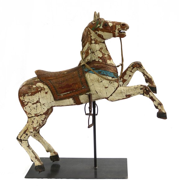 Cavallo da giostra in legno laccato con inserti in cuoio, secolo XIX (cm 115x126x30) Su supporto in metallo (mancanze)