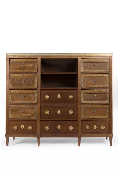 Mobile cartonnier in mogano con otto cassetti in pelle impressi in oro nei montanti e cinque di cui tre in linea con guarnizioni in bronzo. Piano in marmo grigio decorato con ringhiera traforata. Francia, inizio secolo XX (cm 123,5x138x40) (difetti)