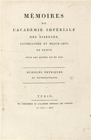 [ACCADEMIA DELLE SCIENZE DI TORINO] - Due volumi di Memoires de l'academie imperiale des sciences: Literature et Beaux-arts e Sciences Physiques et Mathématiques [quest'ultimo LEGATO CON:] Memoires presentes a L'Academie. Torino: Imprimerie de l'Académie Impériale des Sciences, 1805. -